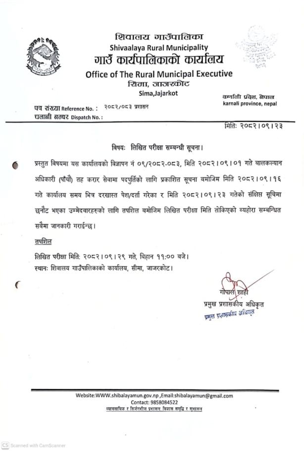 बालकल्याण अधिकारी पदको लिखित परीक्षा सम्बन्धि सूचना l