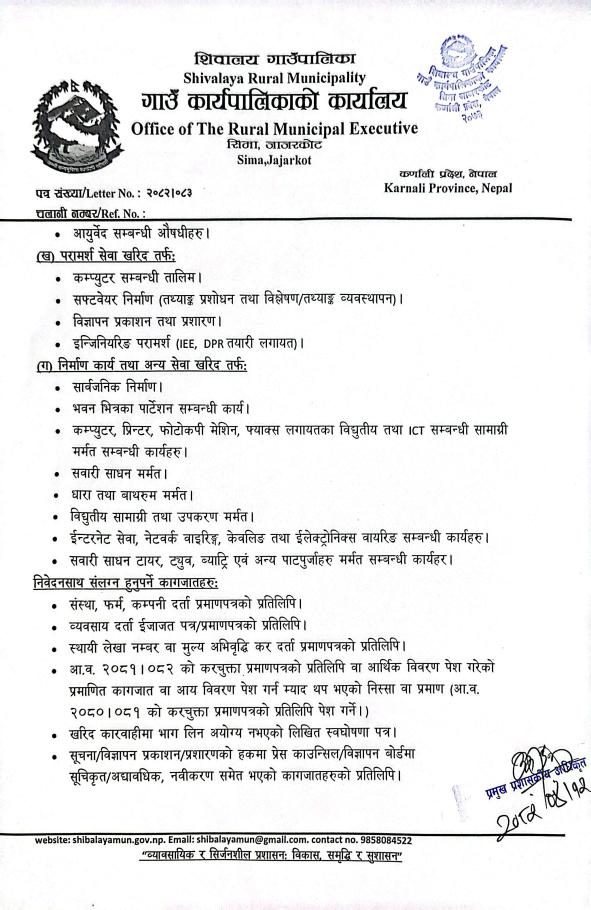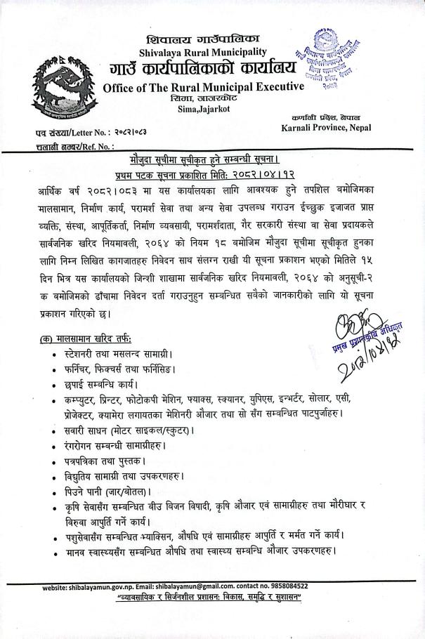 शिवालय गाउँपालिकाको विकास, समृद्धि र सुशासनका लागि नागरिकको सहयोग र सहभागिता अपरिहार्य हुन्छ । सेवा प्रवाह र विकास निर्माणका काममा यहाँको सल्लाहसुझाव र सहयोगको अपेक्षा गरिएको छ । शिवालय गाउँपालिका भित्र कुनै गुनासा ,सिकायत उजुरी,सल्लाह,सुझाव र सहयोगको लागि सम्पर्क नं. ९८४३०५८००५, ९८५१३२३१२१ र ९८५८०८४५२२ मा फोन गर्नुहुन अनुरोध छ ।