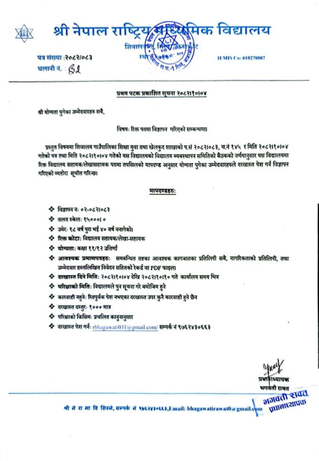 रिक्त पदमा विज्ञापन गरिएको सम्बन्धमा (श्री नेपाल राष्ट्रिय माध्यमिक विद्यालय शिवालय १ सिस्ने)