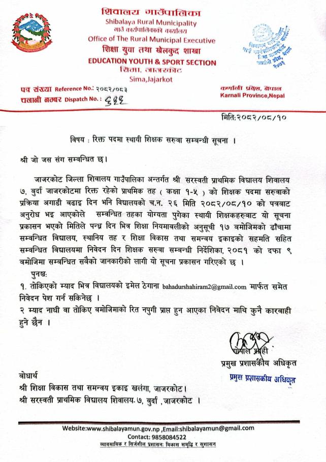 रिक्त पदमा स्थायी शिक्षक सरुवा सम्बन्धी सूचना ।(श्री सरस्वती प्राथमिक विद्यालय शिवालय ७)