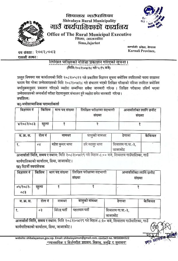 लिखित परिक्षाको नतिजा प्रकाशन गरिएको सम्बन्धमा ।