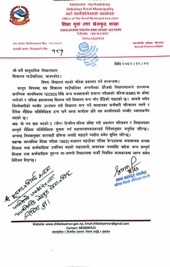 विद्यालय तहको नतिजा प्रकाशन गर्ने सम्बन्धमा।