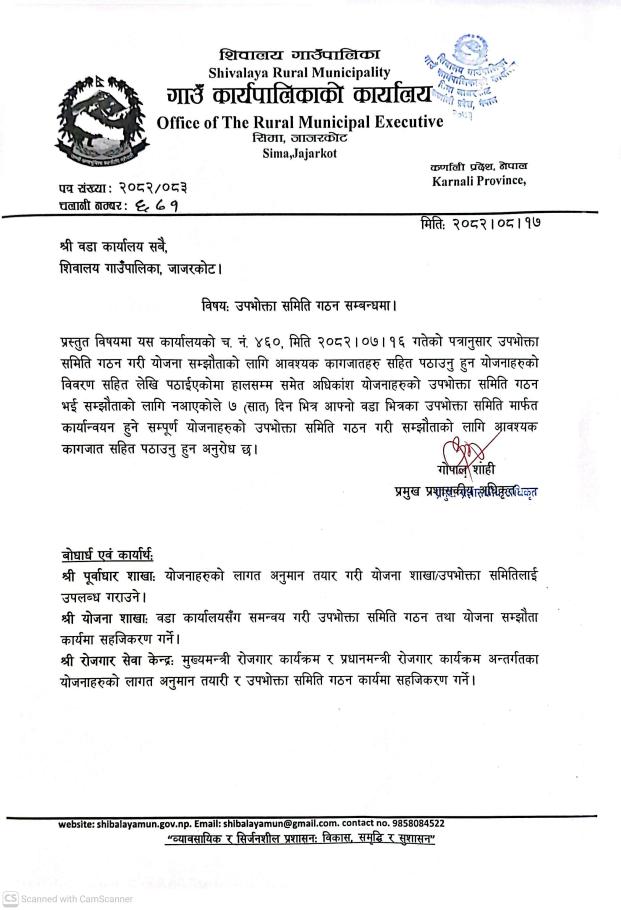 श्री वडा कार्यालय सबै, शिवालय गाउँपालिका, जाजरकोट। उपभोक्ता समिति गठन सम्बन्धमा ।