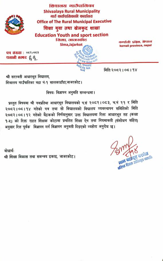 श्री सरस्वती आ.वि शिवालय १ को बिज्ञान अनुमति सम्बन्धमा।