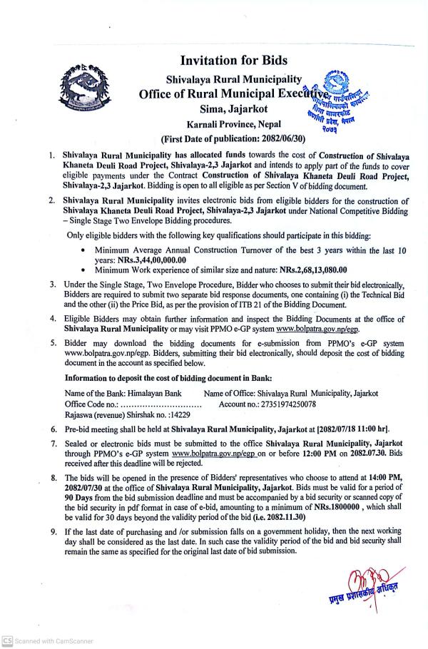 Invitation for Bids for construction of shivalaya khaneta deuli road project, shivalaya-2,3 jajarkot