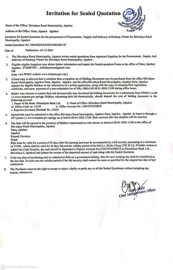 Invitation for Sealed Quotation for the Procurement, Supply and Delivery of Desktop, Printer for shivalaya rural municipality jajarkot