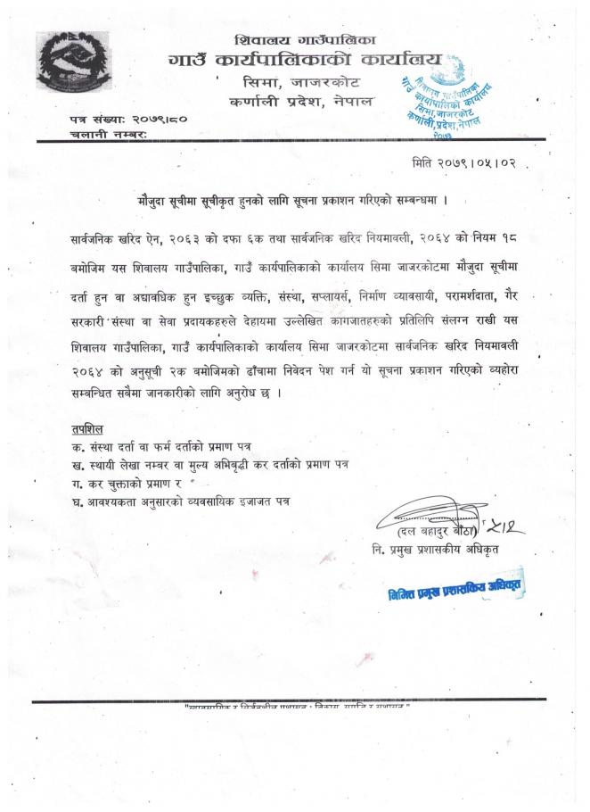 मौजुदा सुचीमा सुचीकृत हुनको लागि सुचना प्रकाशन गरिएको सम्बन्धमा ।