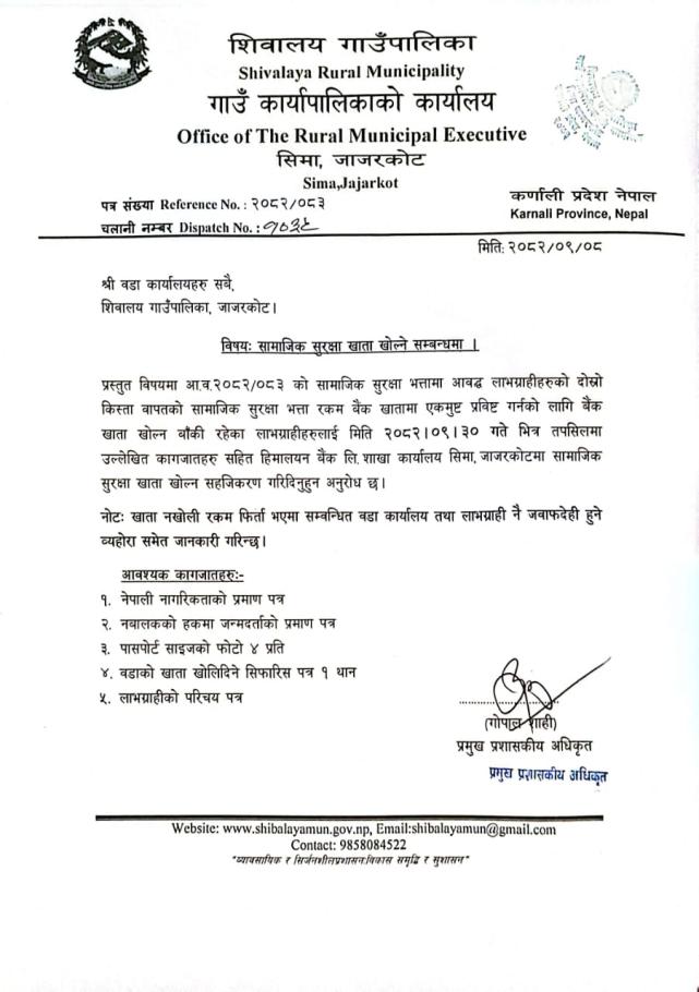 शिवालय गाउँपालिकाको विकास, समृद्धि र सुशासनका लागि नागरिकको सहयोग र सहभागिता अपरिहार्य हुन्छ । सेवा प्रवाह र विकास निर्माणका काममा यहाँको सल्लाहसुझाव र सहयोगको अपेक्षा गरिएको छ । शिवालय गाउँपालिका भित्र कुनै गुनासा ,सिकायत उजुरी,सल्लाह,सुझाव र सहयोगको लागि सम्पर्क नं. ९८४३०५८००५, ९८५१३२३१२१ र ९८५८०८४५२२ मा फोन गर्नुहुन अनुरोध छ ।
