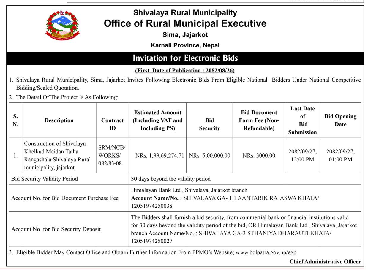 Invitation for Electronic Bids for Construction of shivalaya khelkud Maidan Tatha Ranghshala Shivalaya Rural Municipality, Jajarkot