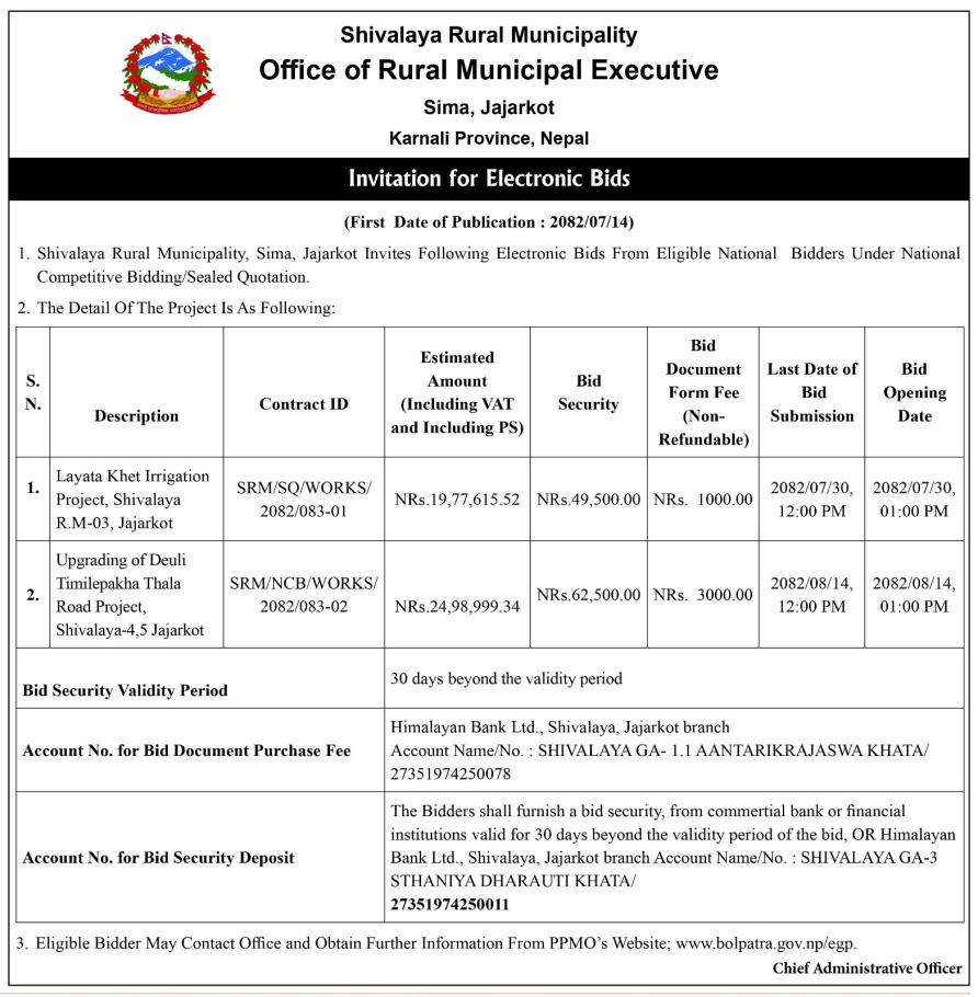 Invitation for Electronic Bids for Layeta Khet Irrigation and Upgrading of Deuli Timilepakha Road Project